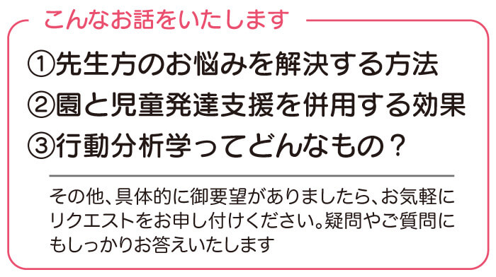 保育園様、幼稚園様にバンブーハットキッズのスタッフがおうかがいし、先生方に当方の活動や「療育内容、考え方、具体的な手法」などを出張セミナーという形でお聞きいただくものです。