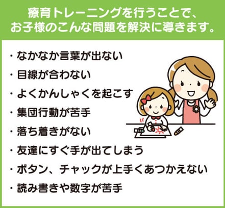 マンツーマンでの個別トレーニング、複数のお子様を集めて社会性やソーシャルスキルを養う小集団トレーニングなどを組み合わせ、未就学児童の発達支援や問題行動の改善などを目的に「療育」を進めていきます。